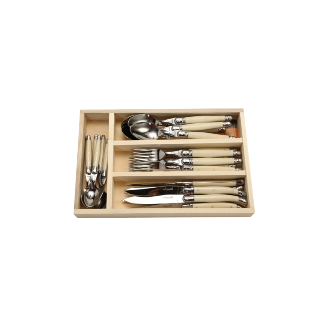 Classic 24-piece flatware set featuring elegant ivory handles and durable stainless steel heads. Designed for everyday dining, the set comes neatly organized in a storage tray for easy drawer placement and convenient table setting.