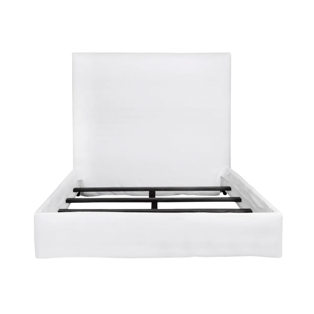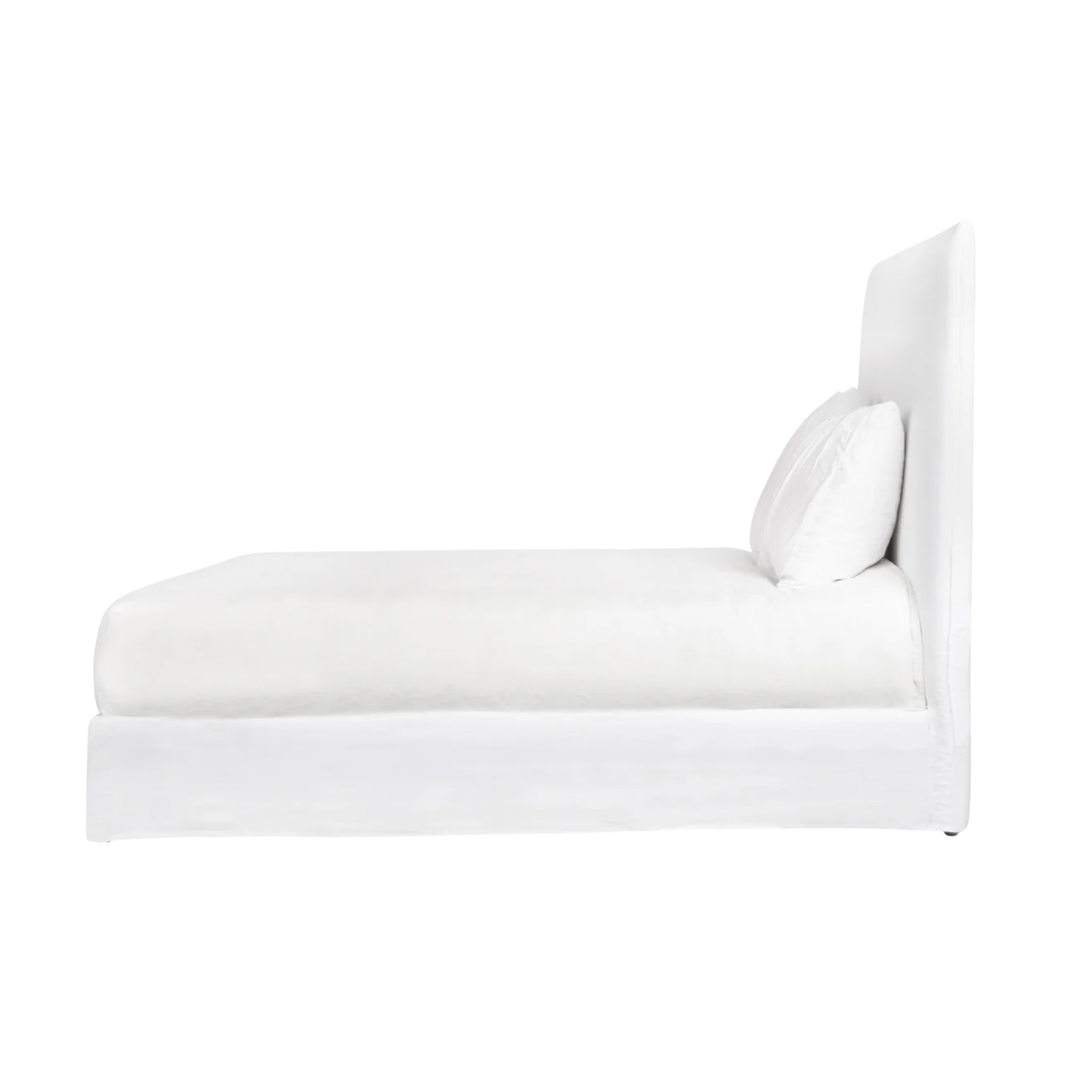This tall twin bed features a classic design with a soft, removable slipcover in Denim White fabric. Its clean lines and versatile look make it an ideal addition to any bedroom, while the slipcover ensures easy maintenance and durability.