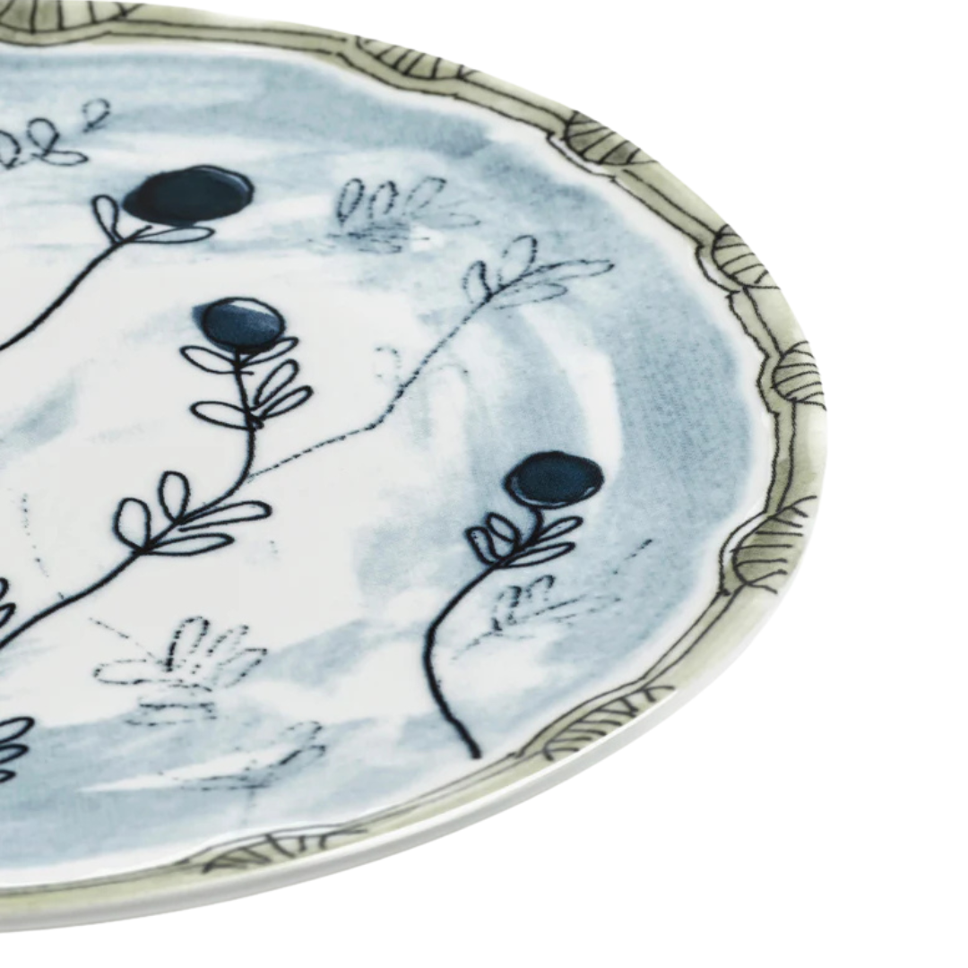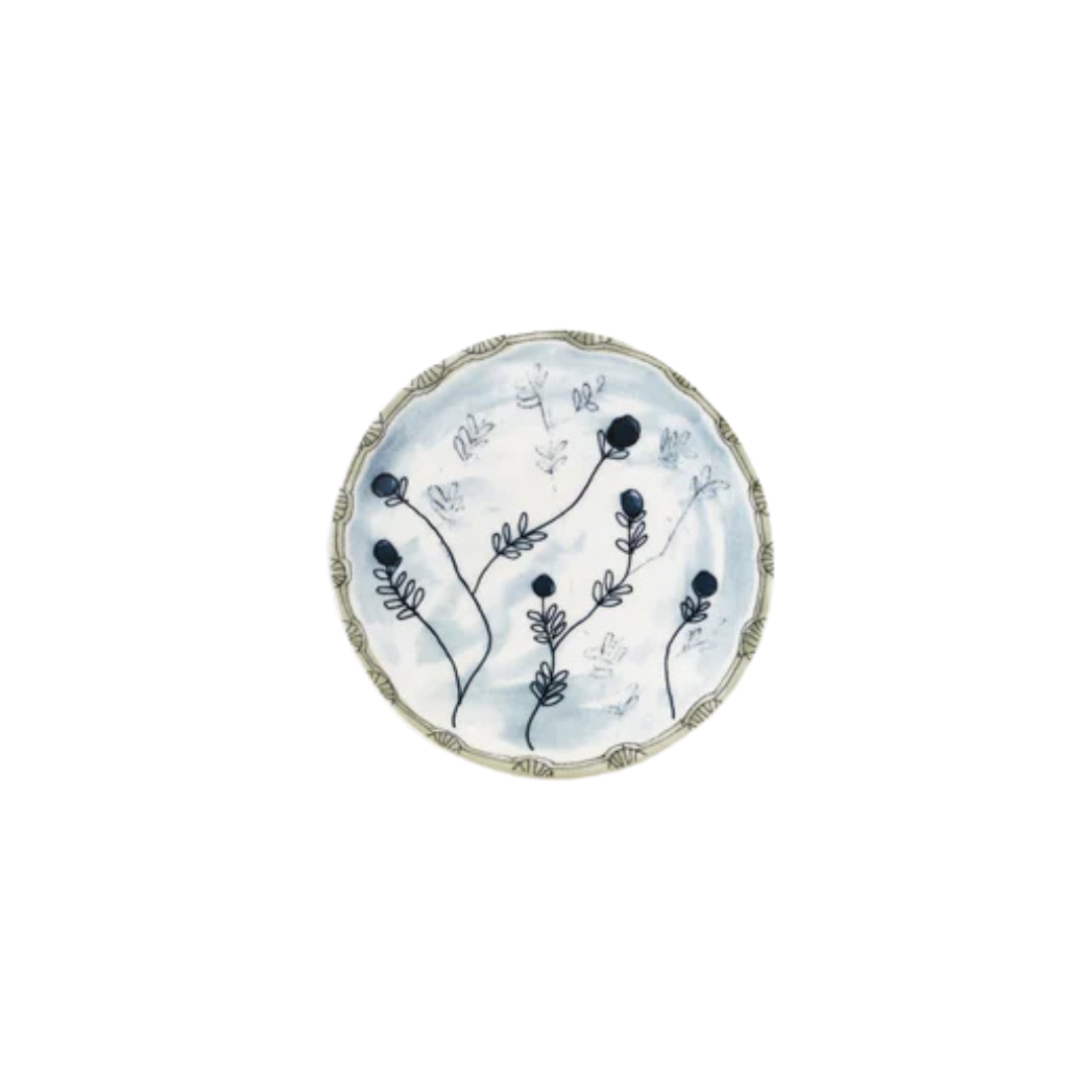 A porcelain bread plate with a soft blue glaze and botanical motif, combining artisanal charm with modern elegance for everyday or special occasions.