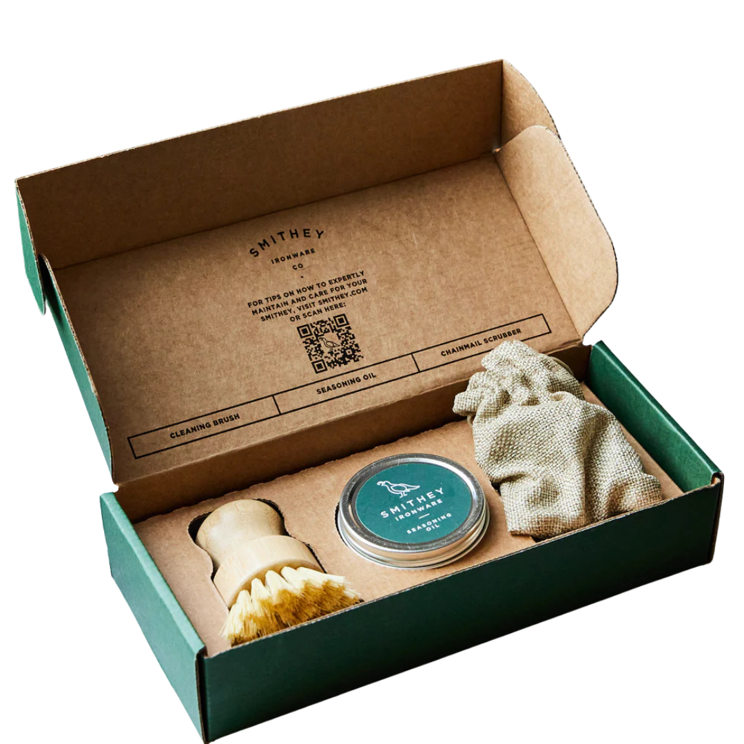 This Cleaning & Care Kit includes everything needed to maintain your cast iron cookware, featuring a brush, scraper, and seasoning oil to keep your pans in top condition.