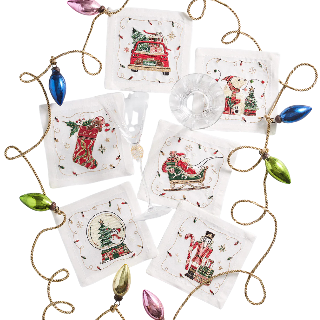 A festive set of six linen cocktail napkins featuring deluxe embroidery in holiday motifs, designed to bring sparkle and elegance to seasonal gatherings.