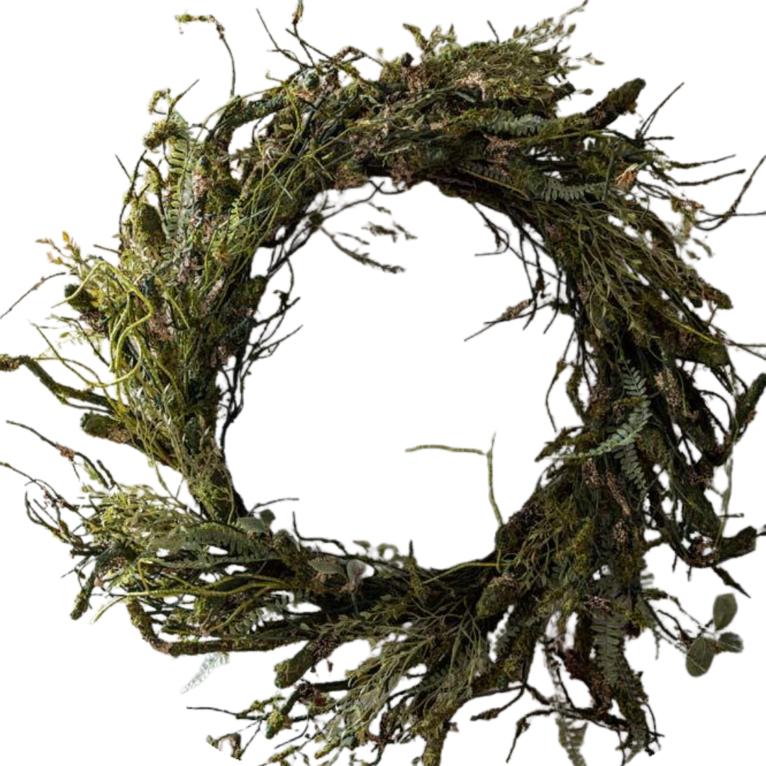 Bring natural texture and depth to your space with this forest-inspired wreath. Featuring a lush mix of woodland foliage, it adds an organic, moody touch to doors, walls, or mantels—perfect for year-round styling with no maintenance required.