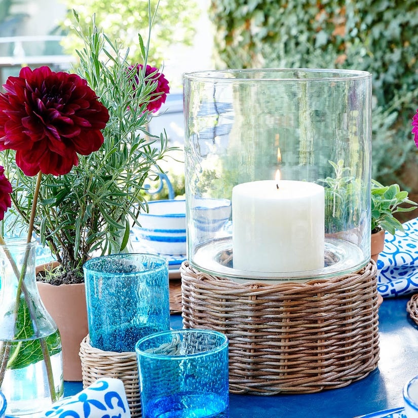 Hurricane candle holder in honey‑hued rattan with glass inserts, perfect for elevating indoor or outdoor décor with warm, ambient lighting.