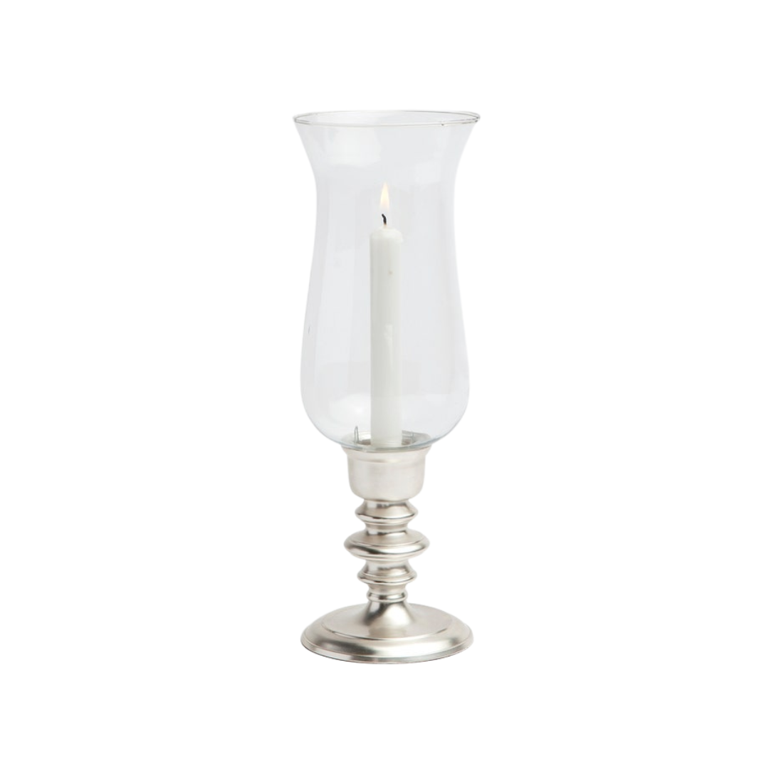 Matte silver hurricane-style candle holder with a metal base and glass cylinder insert, designed to shield flame from wind and create ambient lighting.