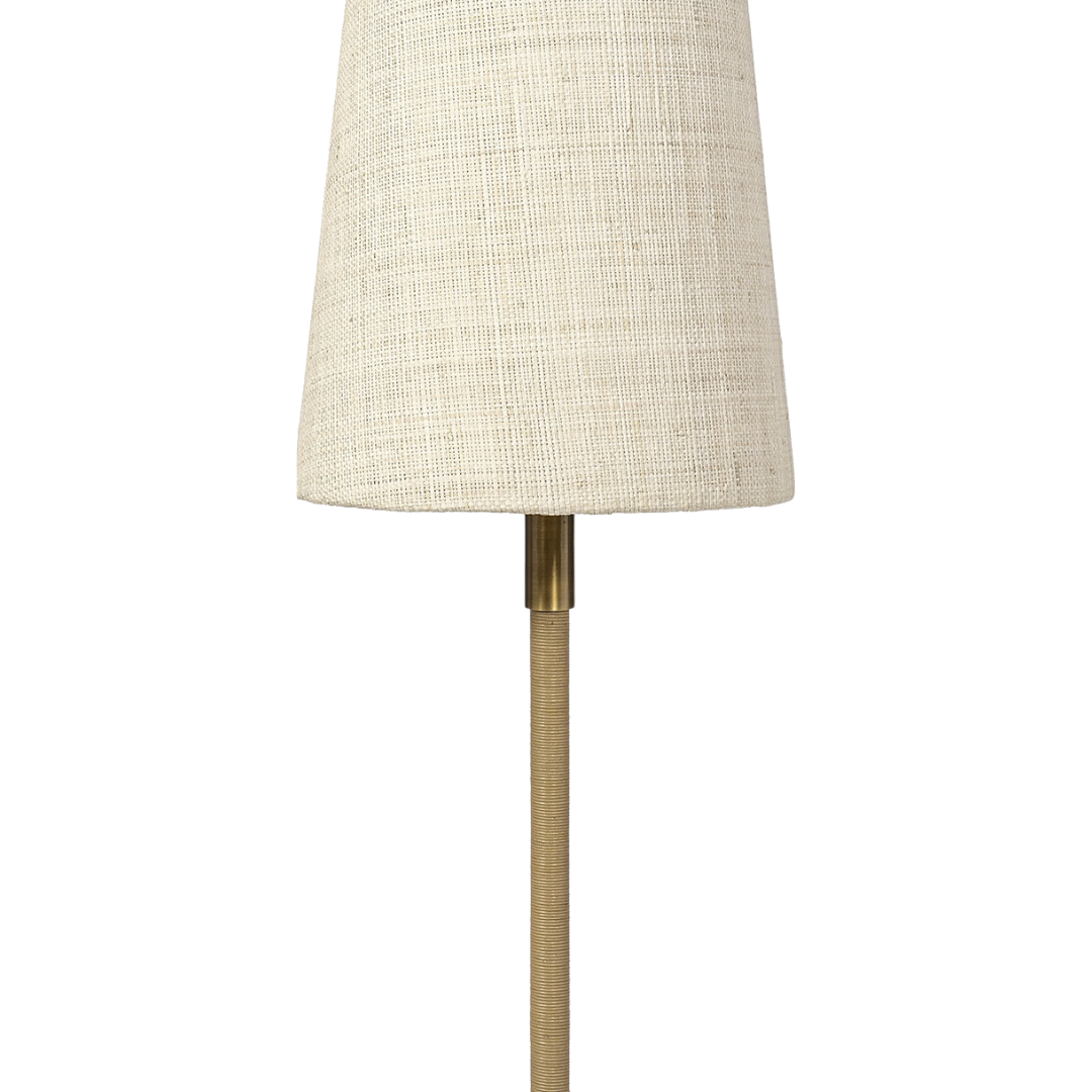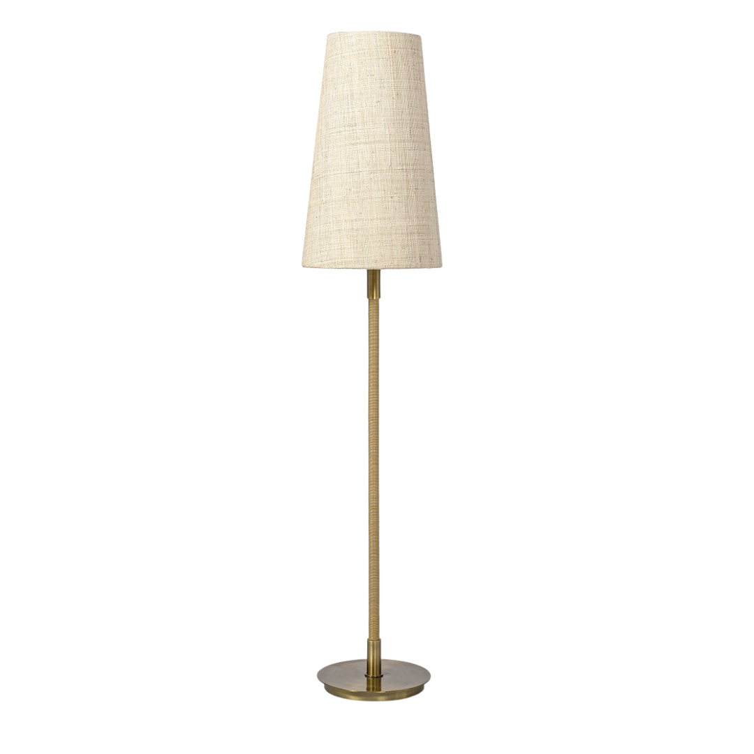 The Palecek Irving Floor Lamp pairs a sleek metal and brass body with a tan leather-wrapped pole and a natural raffia shade, creating a luxe yet relaxed lighting statement.