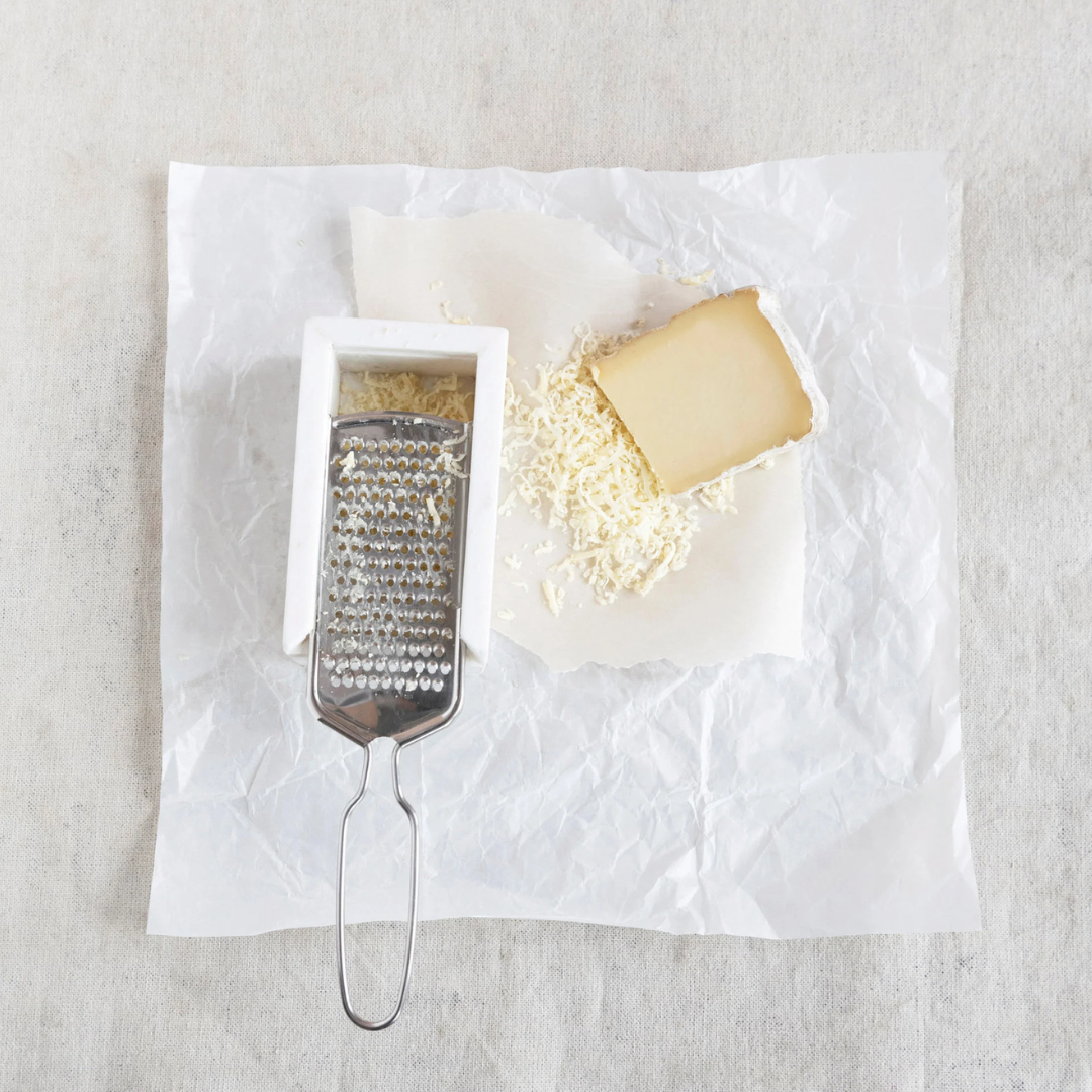 A sleek and functional kitchen accessory combining a marble base and a detachable stainless steel grater. The grater fits neatly into the marble housing for stylish countertop storage and easy access.