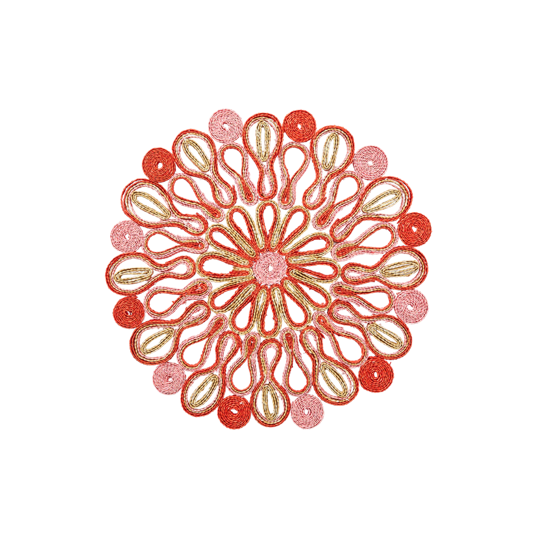Handwoven wheatgrass placemat in vibrant pink and orange with a sunburst design that adds bold texture and color to the table.