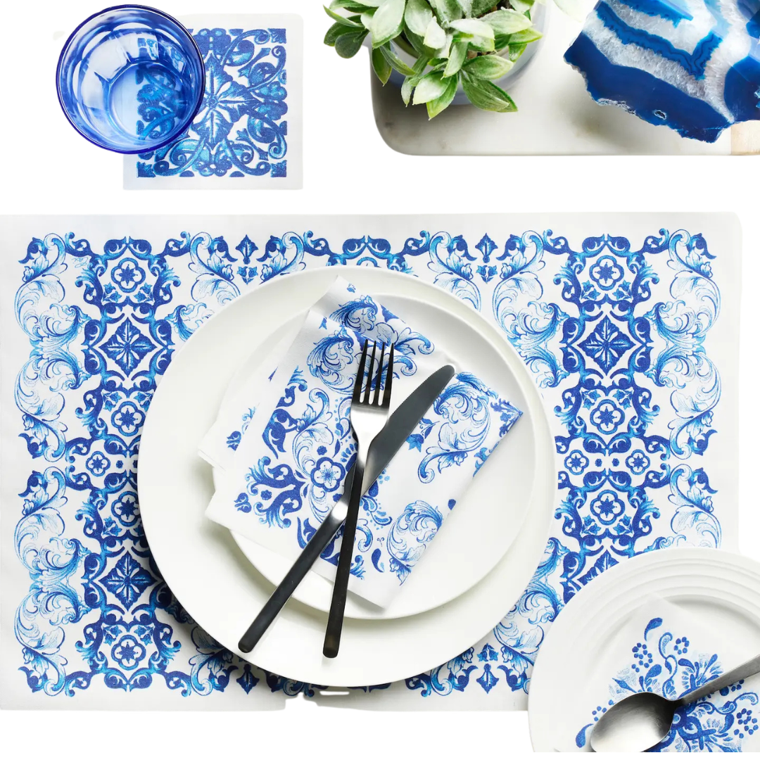 Soft and absorbent cotton cocktail napkins featuring a vibrant Mediterranean tile pattern. Perfect for entertaining, they add a refined, coastal-inspired touch to any gathering.