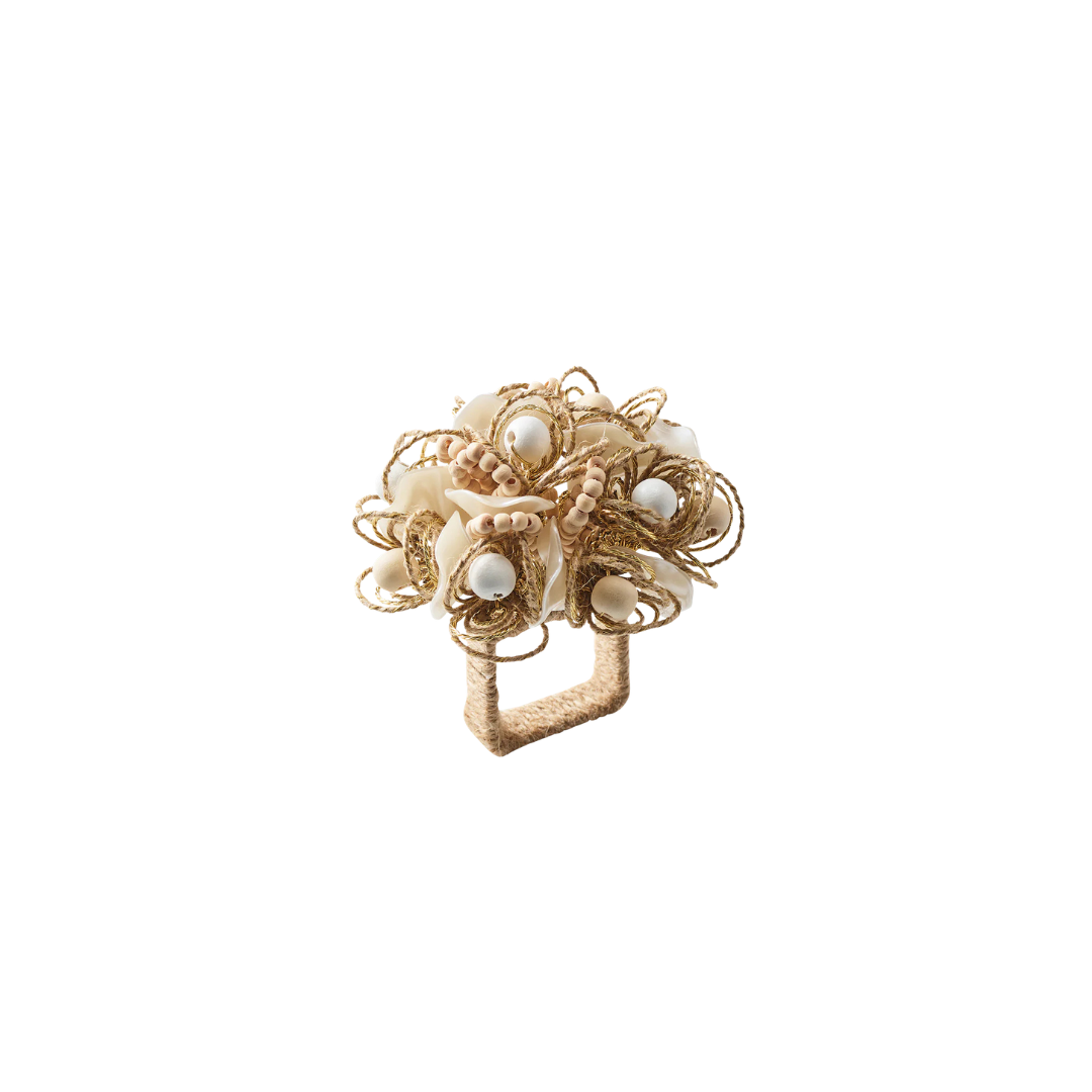 Hand-arranged beads, shells, and jute create an organic bramble-inspired design with elegant gold accents—perfect for adding natural texture and sophistication to any table setting.