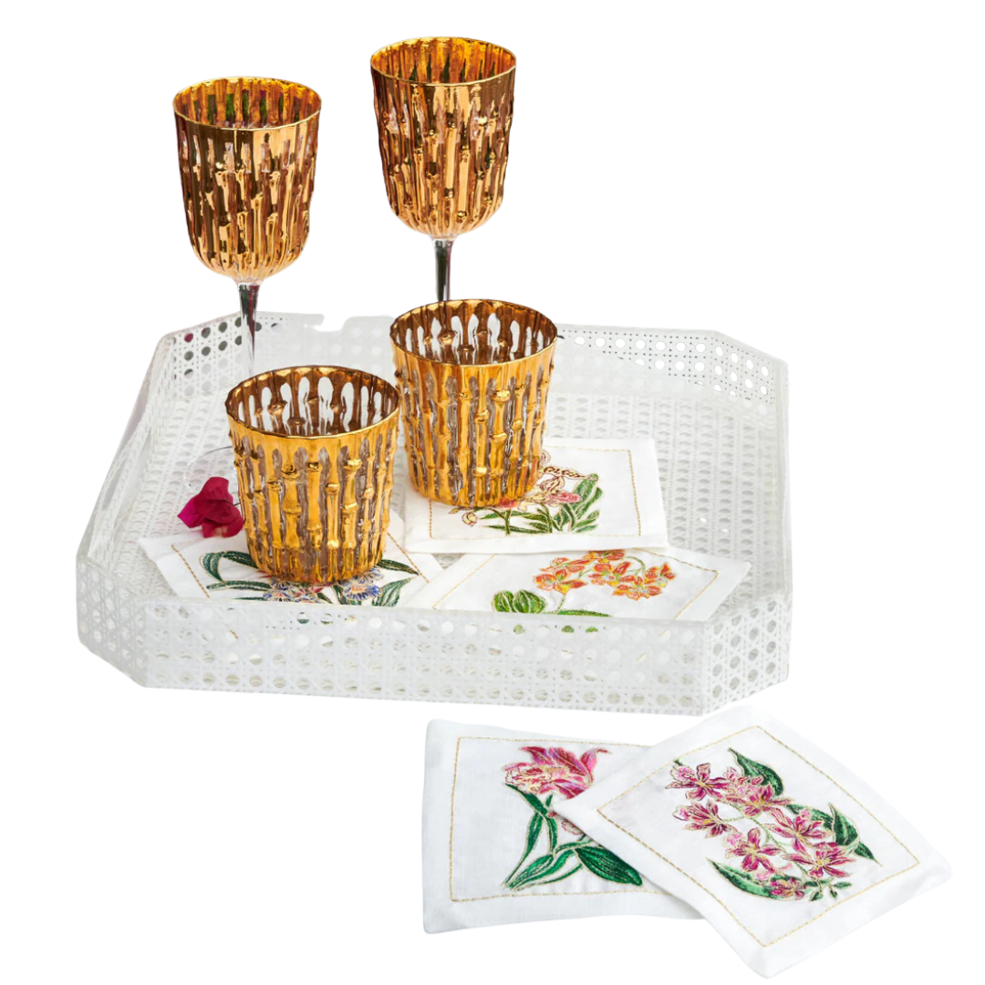 A cocktail napkin set featuring beautifully embroidered orchid designs, bringing an elegant botanical touch to cocktail hour and entertaining.