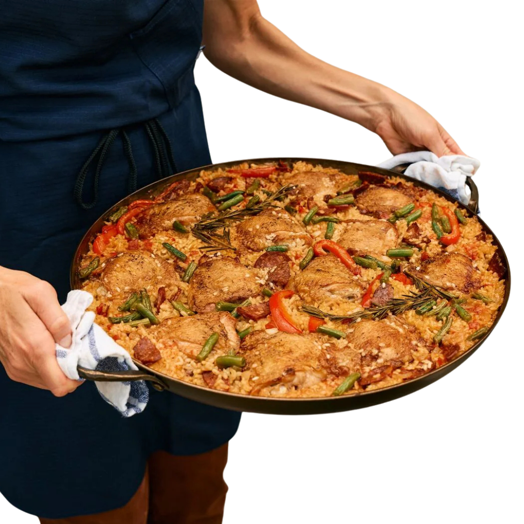 This cast-iron Paella Pan offers even heat distribution and a crispy socarrat. Pre-seasoned for a non-stick surface, it’s perfect for making traditional paella on stovetops or open flames.