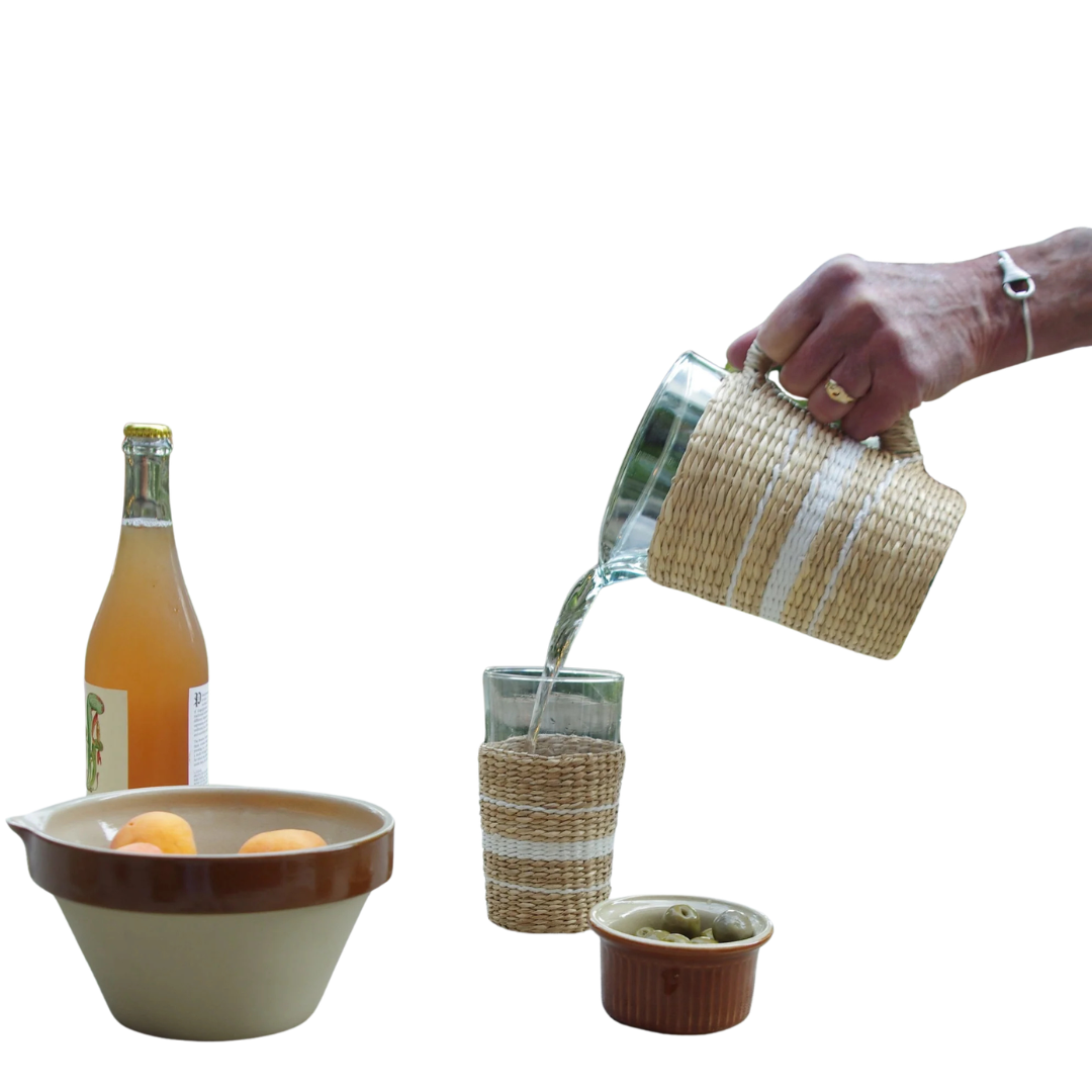 A handcrafted glass pitcher wrapped in natural seagrass with crisp white stripe detailing, bringing a relaxed coastal feel to everyday serving and entertaining.