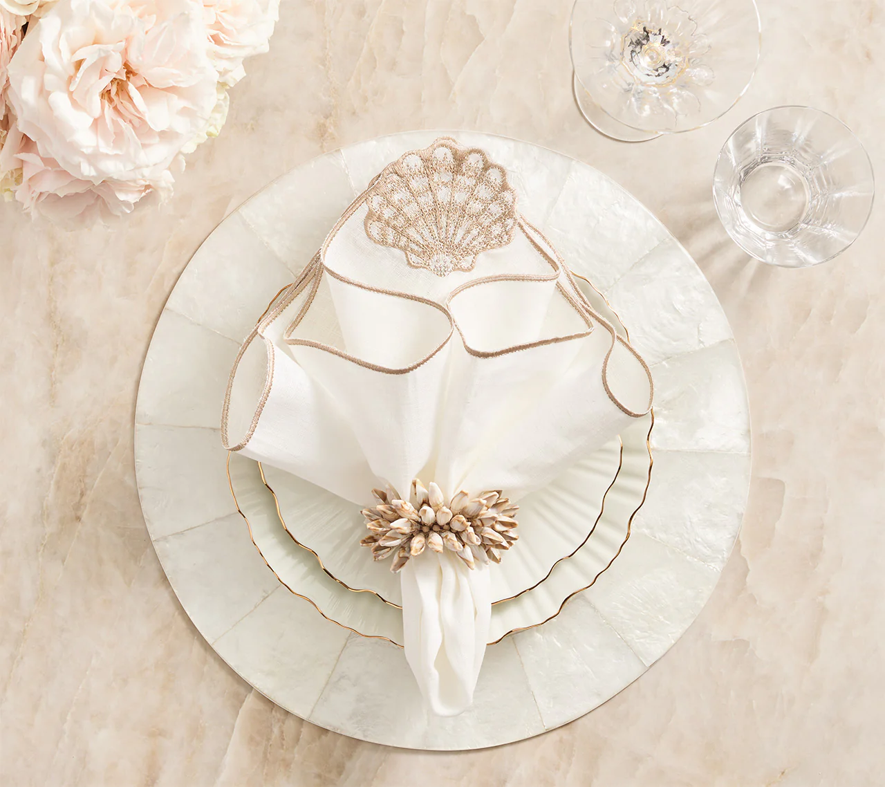 Bring coastal charm to your table with this shell fringe napkin ring. Featuring natural shells and soft fringe detailing, it adds a breezy, beach-inspired touch to any setting.