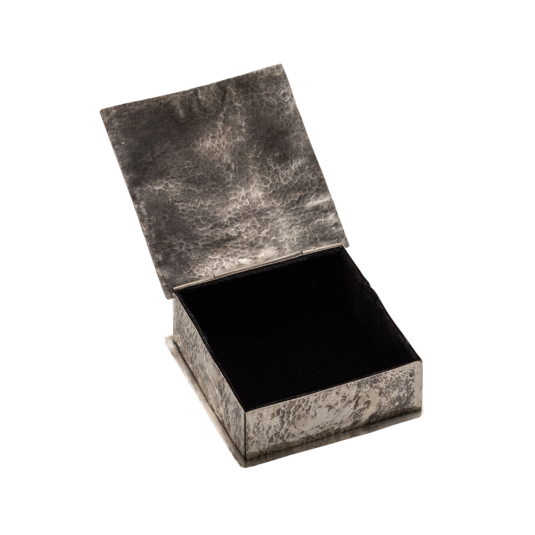 A handcrafted silver-toned decorative box featuring a textured dimpled finish, accented with a cross and turquoise stone. Perfect for storing small treasures while adding a distinctive Southwestern-inspired touch to any space.
