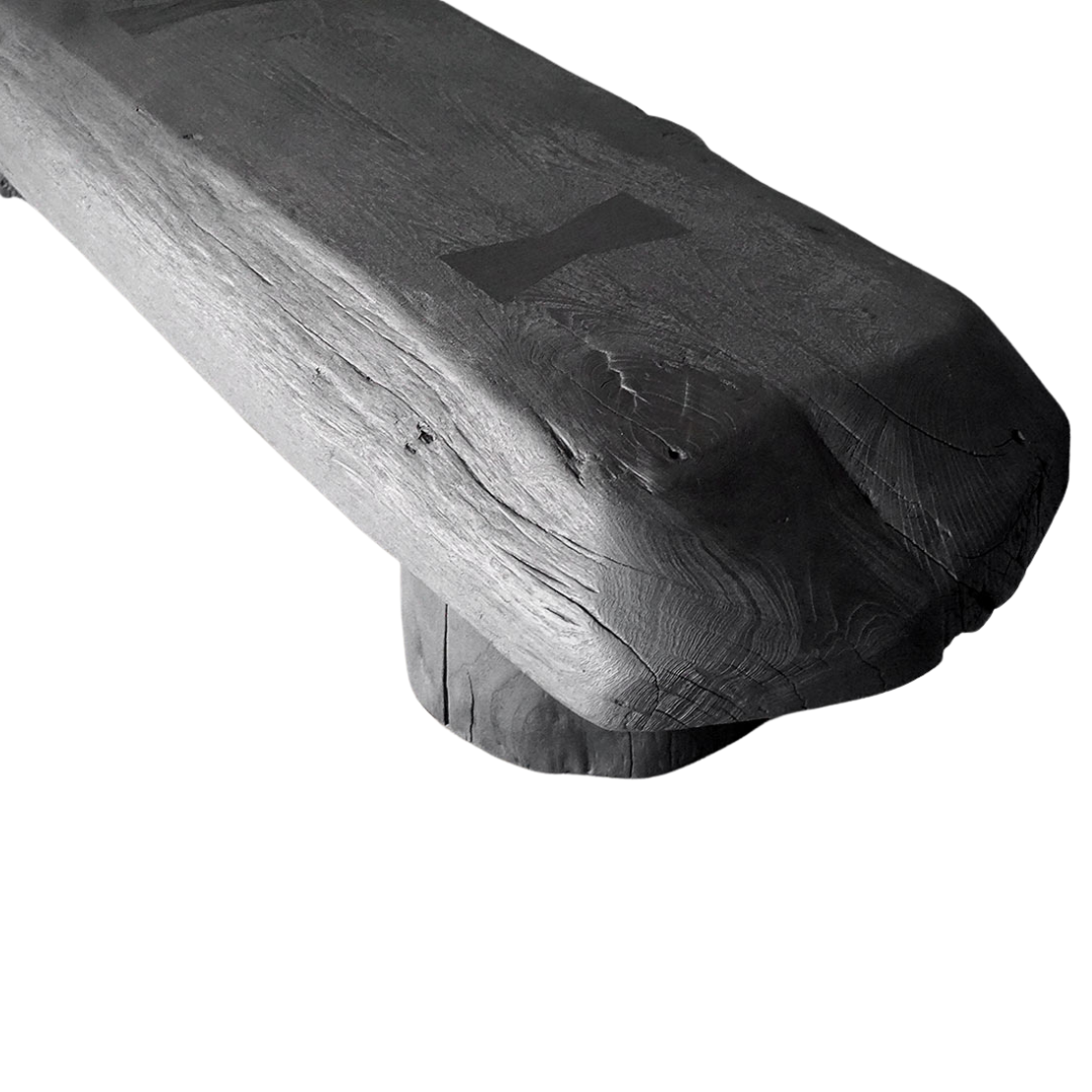 A sculptural bench crafted from solid teak with a deep charcoal finish, blending natural warmth with modern elegance. Its smooth design and sturdy build make it a striking addition to entryways, living rooms, or covered outdoor spaces.